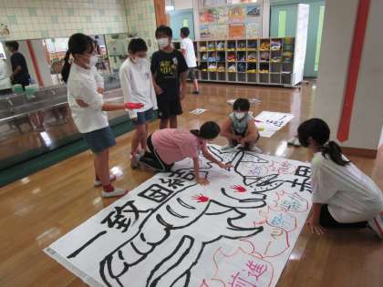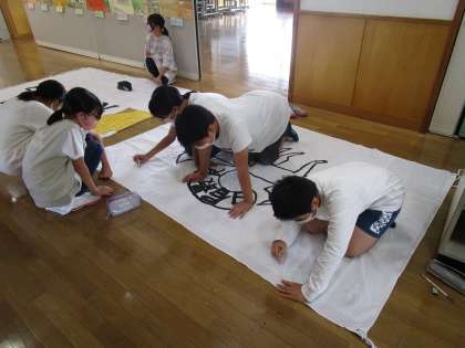 各団、運動会に向けて団旗を製作しています。団旗には、団のデコレーションやスローガン、団のみんなの思いなどを描いたり、書いたりしていきます。