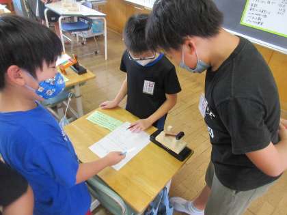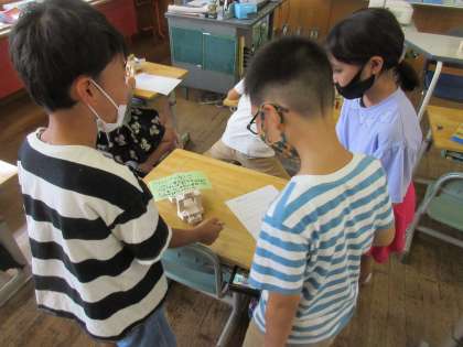 図画工作科「くぎうちトントン」で作った作品に、題名と解説を付け、互いに見合いました。
