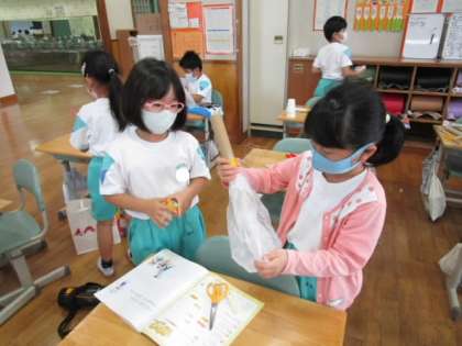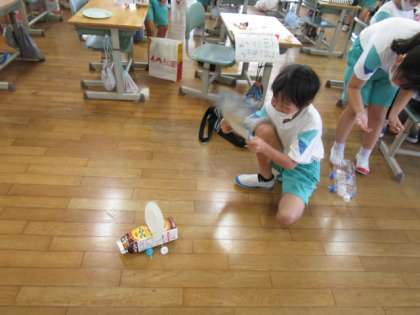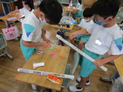 動くおもちゃ作りをしました。わからないところを教え合ったり、一緒に作ったりする姿が見られました。実際に動かしてみて、変えたらいいなと思うところを見付けるなど、試行錯誤しながら作っています。