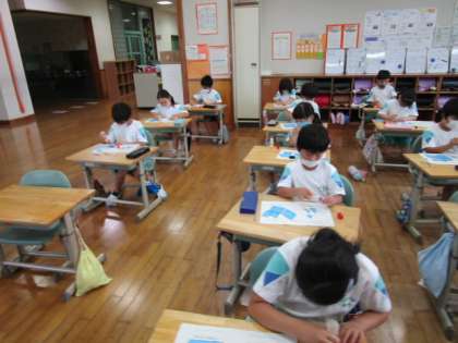 教科書についている形を2つの仲間に分ける学習をしました。角の数や直線の数に注目することで、普段から使っている三角や四角の特徴について知ることができました。