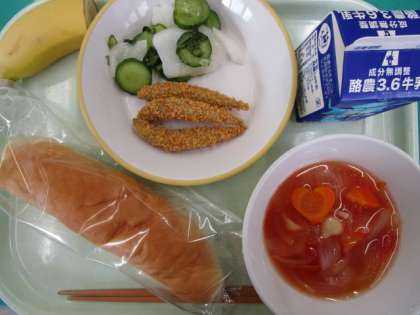 今日の献立は、米粉コッペパン、牛乳、きびなごのさくさく揚げ、かぶのサラダ、トマトスープ、バナナ です。
