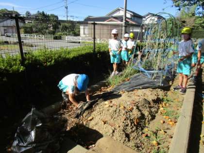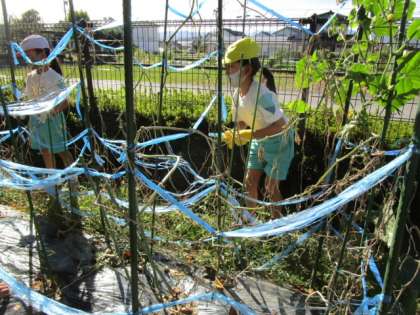 5月に植えた野菜の片付けを行いました。お互いに声をかけながら、茎から支柱を外したり、マルチシートを外したりなど元の畑になるようにしました。