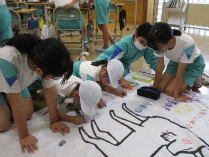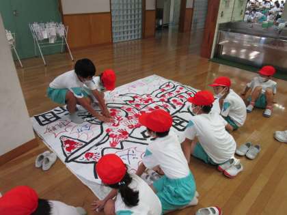運動会に向けて製作している団旗が仕上がってきました。今日は、1年生と2年生に手形や運動会に向けての意気込みを書いてもらいました!