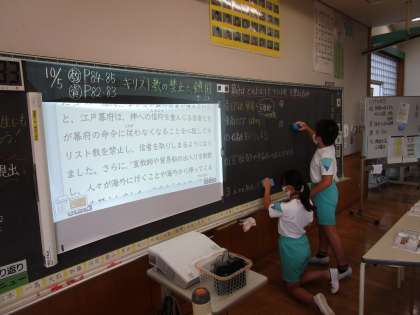今日の社会科の学習では、「江戸幕府がどのようにしてキリスト教を禁止にしたのか」について調べました。調べて分かったことや疑問に思ったことをみんなで共有して、確認しています。