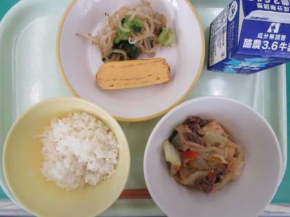 今日の献立は、ご飯、牛乳、すき焼き、厚焼き卵、おひたし です。