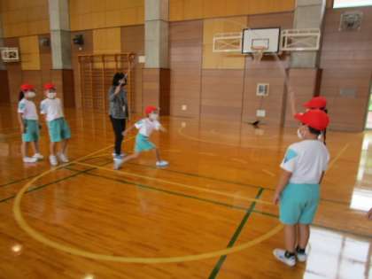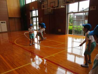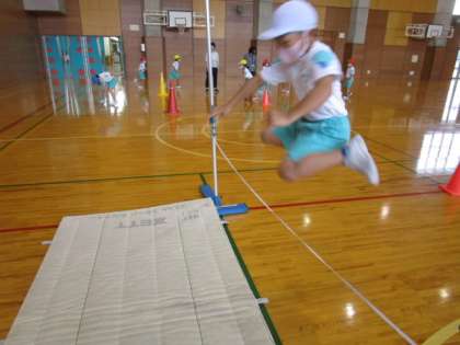 まずは、8の字跳びで体を慣らしました。タイミングを見て入ったり抜けたりスムーズに行うことができました。また、70cmにゴムを設置し、高くジャンプする練習をしました。跳び越えられるように、練習していきます。