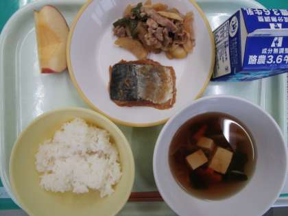今日の献立は、ご飯、牛乳、さばの味噌煮、マコモタケのオイスターソース炒め、きのこ汁、りんご です。(きときとランチ)