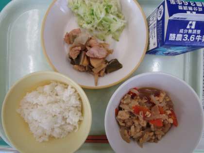 今日の献立は、ご飯、牛乳、厚揚げの錦とじ、あっさりチキン、ゆでキャベツ です。