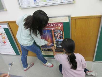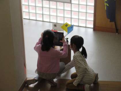 図画工作科の時間に、小さく印刷してラミネートした自分の写真を持って学校内のいろいろな場所で写真を撮りました。