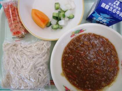 今日の献立は、ソフト麺、牛乳、カレーソース、チーズドック、ころころサラダ、かきです。今日のデザートの「柿」は、大きな柿1個で一日に必要な量がとれるほど多くのビタミンCが含まれています。柿の葉っぱにもビタミンCが多く含まれていて、お茶として飲まれています。