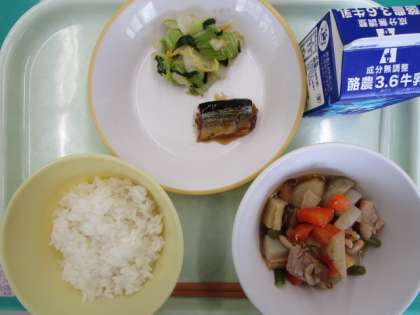 今日の献立は、ご飯、牛乳、筑前炊き、さんまのマーマレード煮、生姜ひたし です。