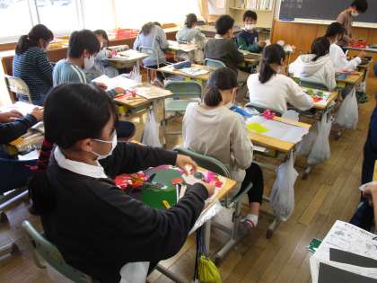 きれいな光を感じる「ランプシェード」が完成に近づいてきました。黒色の画用紙とセロハンの使い方を工夫し、丁寧に作品を製作しています。