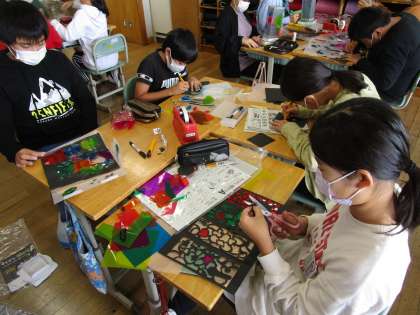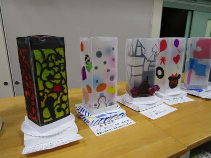 きれいな光を感じる「ランプシェード」が完成に近づいてきました。黒色の画用紙とセロハンの使い方を工夫し、丁寧に作品を製作しています。