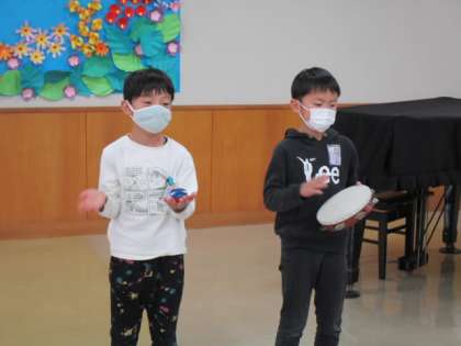 グループごとに練習した「山のポルカ」の発表会を行いました。それぞれのグループのよさを生かし、演奏の始め方や繰り返し、鍵盤ハーモニカの交互演奏など工夫が見られました。素敵な曲が広がり、楽しい気持ちになりました。