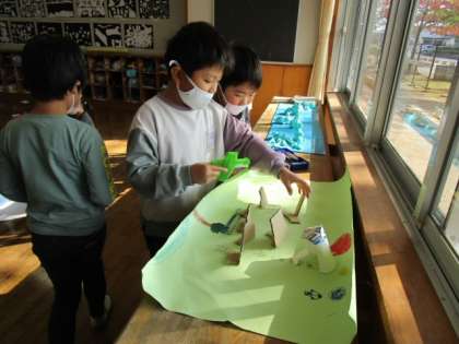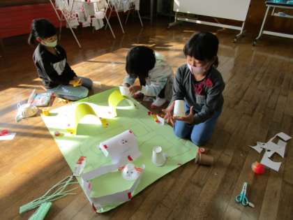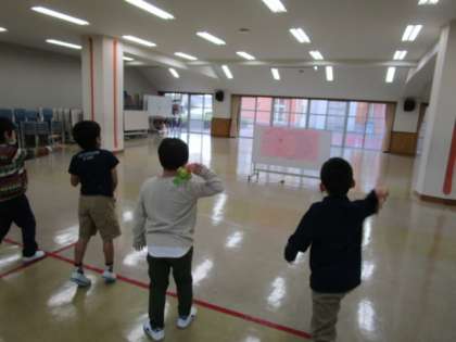自分で作った動くおもちゃを使って、みんなで楽しく遊びました。みんなで的を作ったり、コースを作ったりと様々な工夫が見られました。この後予定している「みんなで遊ぶおもちゃ大会」が楽しみです。