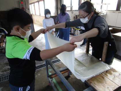保内小学校では、毎年自分たちの証書を自分たちで紙を漉くところから始めます。世界でたった一枚の証書を作るために子供たちは真剣に作業をしていました。どんな紙になるのか、出来上がりが楽しみです。