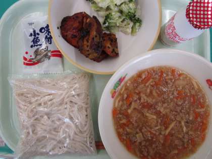 今日の献立は、ソフト麺の肉みそかけ、大学芋、花野菜サラダ、味付け小魚、飲むヨーグルト です。