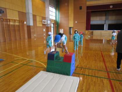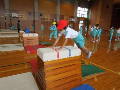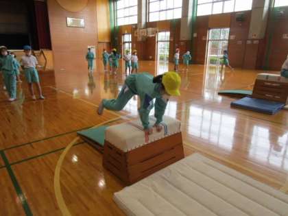 少しずつ跳び箱に慣れてきたので、段数を上げたり新しい跳び方に挑戦したりしています。閉脚跳びでは、足を閉じて跳ぶので、練習用の跳び箱で練習しています。少しずつ本物の跳び箱でも閉脚跳びの練習を始めました。できることが増えるようにしています。