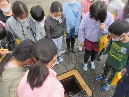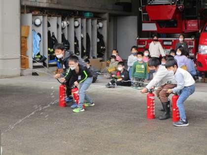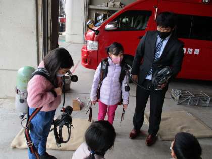 富山市消防局では、消火器体験をしたり、空気呼吸器を担がせていただいたりしました。子供たちは、社会科の学習で学んだことを実際に確かめようと、積極的に質問し、一生懸命メモを取っていました。