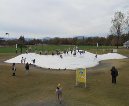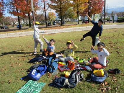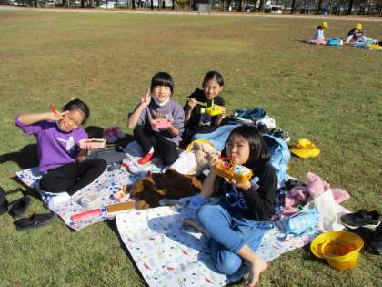 子供たちは少し遊具で遊んだ後、レジャーシートを敷き、楽しそうにお弁当を食べていました。