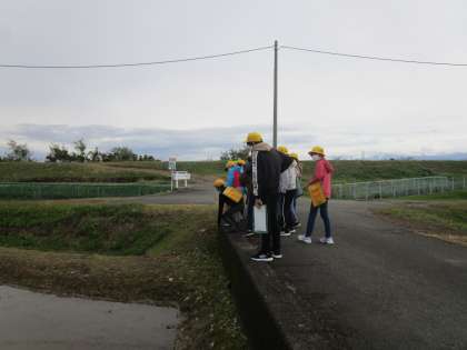 今日は、流れる水の働きをくわしく学ぶために井田川を見に行きました。子供たちは、川の内側と外側で流れる水の速さが違うことに気付いていました。
