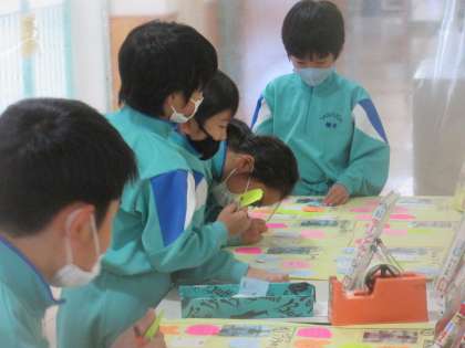 写真は、先日図書委員会が行った「ビブリオバトル」で紹介された本にコメントを書いている様子です。