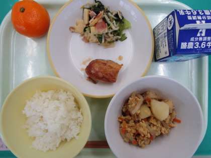 今日の給食の献立は、ご飯、牛乳、卵とじ、照り焼きチキン、チンゲンサイソテー、みかん です。
