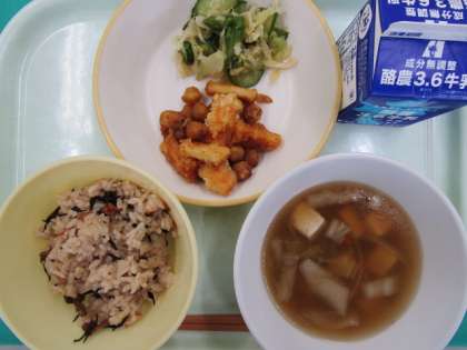 今日の献立は、ひじきごはん、牛乳、いかと豆のカレー揚げ、グリーンサラダ、豆腐スープ です。