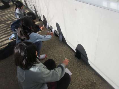 虫めがねで日光を集めながら、「光の円を小さくすると煙が出てきた!」「黒い画用紙より白い画用紙に光を当てた方がまぶしいよ!」と友達同士気づいたことや思ったことを伝え合っていました。