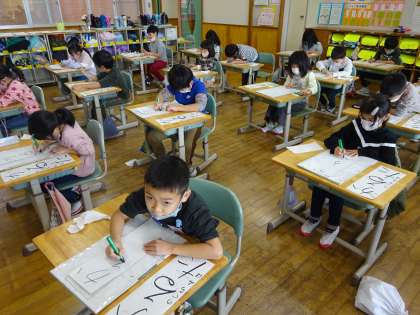 今日からは、硬筆墨を使って書き始めました。濃く、ゆっくり書き、じっくりと自分の字と向き合いました。「もっと大きく書いたらよかったな」「ここの曲がるところをゆっくり書こうかな」などと、次回頑張りたいことも見付けていました。