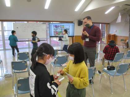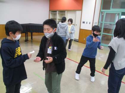 今日は、カード交換ゲームやグループじゃんけんなどの活動を通して、身に付けた表現を繰り返し発話していました。