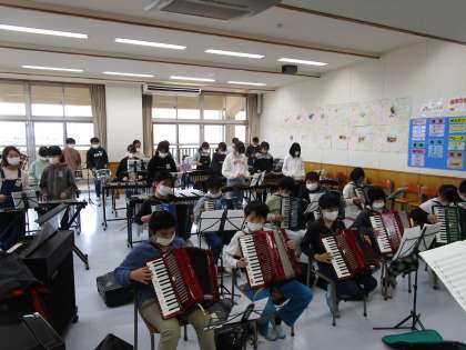 6年生の子供たちは、保内小の校歌の合奏練習をがんばっています。それぞれが自分の演奏したい楽器を選択し、練習に取り組んでいます。