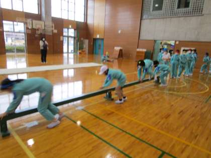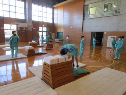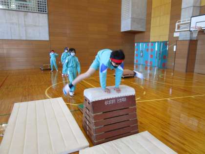 体育では跳び箱の学習を行いました。子供たちは一生懸命に、台上前転や抱え込み跳びなど、たくさんの技を練習し、互いにコツを教え合っていました。
