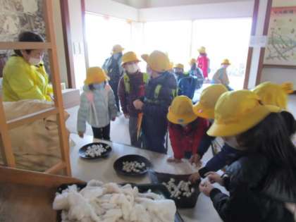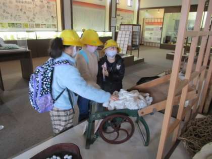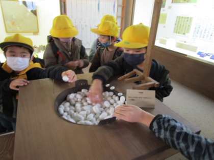 八尾町は養蚕産業が盛んでした。その様子や歴史についての展示を見ました。繭を実際に触ったり、細い糸の様子を見たりと興味をもつことができました。きれいな色に染められた絹糸も展示してありました。