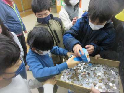 子供たちは、集まった募金の量をみて驚きながら、困っている人のために協力しようという思いで、自分の募金を箱にあけていました。