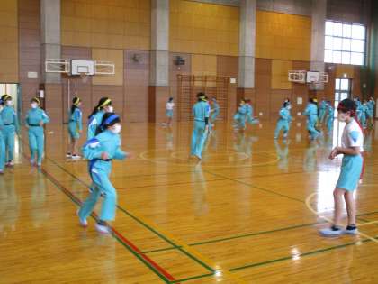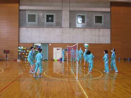ホットケーキ作りの後は、体育館で団対抗の「しっぽ取り」や「ビーチバレー」、「ドッジボール」を楽しみました。