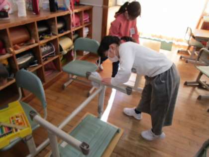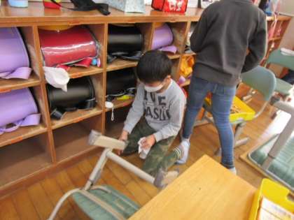 終業式では校長先生の話や生徒指導の話を聞き、2学期の振り返りをしたり冬休みにやりたいことを考えたりしました。そして、よい年を迎えられるように日頃の感謝の気持ちを込めて、机や椅子の脚のほこりを取ったり下駄箱を拭いたりしました。