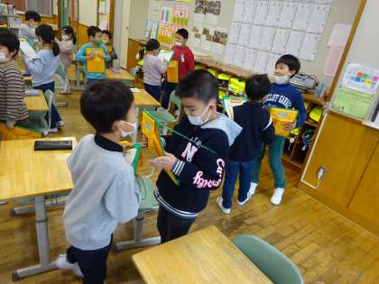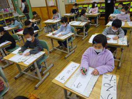 書初大会では、冬休みの練習の成果を出そうと、落ち着いて書きました。1枚目が終わっても、2枚目に向けてどこを直したらよいかを考え、集中して取り組みました。学活では、探偵ゲームを行い、友達との関わりを楽しみました。