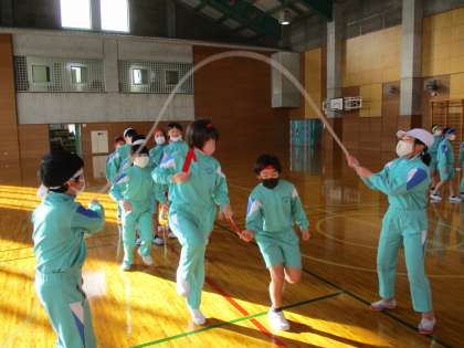 手(タグ)つなぎおにやスタンドアップ、手(タグ)つなぎ長縄などを通して全身を動かしました。特に、スタンドアップや長縄では、「できた!」とうれしそうに取り組む様子が見られよかったです。心も体もぽかぽかになる1時間でした。