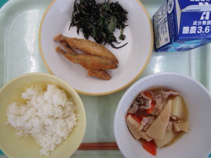 今日の給食の献立は、ご飯、牛乳、わかさぎのフリッター、ひじきのごま和え、豚肉とじゃがいもの南蛮煮 でした。