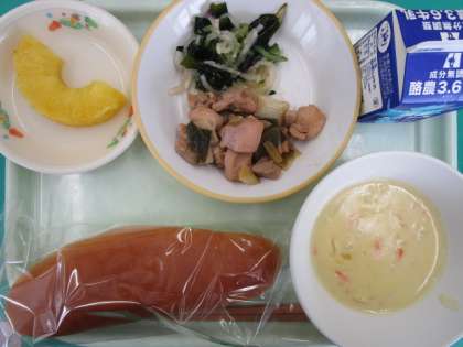 今日の献立は、コッペパン、あっさりチキン、海藻サラダ、野菜ポタージュ、カットパイン です。