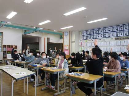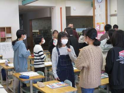 今日の外国科の学習では、様々なゲームを通して小学校の思い出を紹介する英語表現を学んでいます。