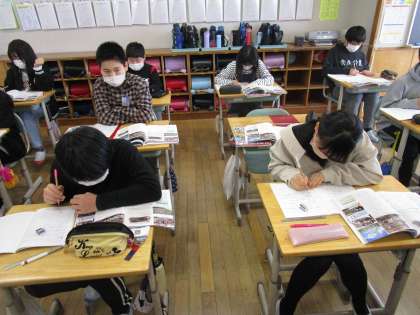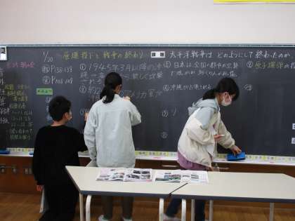 今日の社会科の学習では、太平洋戦争がどのようにして終結したのかを教科書や資料集を使って調べました。調べて分かったことはみんなで共有しています。