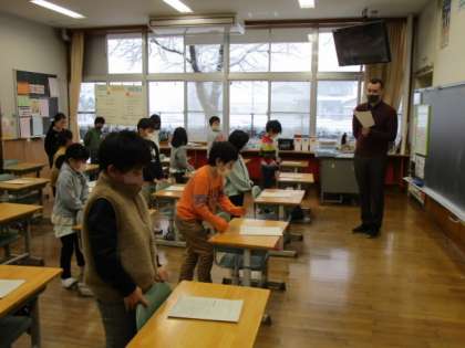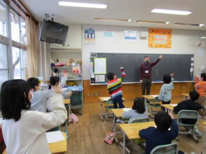 ALTのジェームズ先生に、ドレミの歌やBINGOの歌の英語で教えていただきました。発音をまねしたり、一緒に歌ったりしました。じゃんけんをEnglishで挑戦したり、ジェームズ先生に好きな食べ物やどうしてALTになったのか質問したりしました。楽しく外国語に親しむことができました。