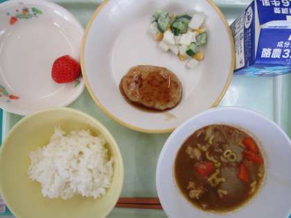 献立は、ご飯、牛乳、おばけのアッチ豆腐ハンバーグ、サイコロステーキ、のらねこスープ、いちご です。