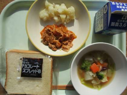 献立は、食パン、牛乳、ポークチャップ、ゆでポテト、百味ビーンズのポトフ、チョコレートクリーム です。