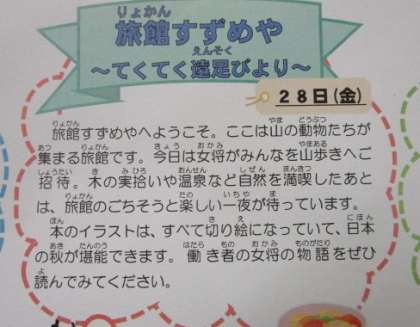 「旅館すずめや」は、すずめの女将が経営する旅館です。かわいい動物のお客さんたちが、旅館すずめやに到着し、和菓子とお茶でくつろぎます。山の上のもみじ湯やきれいは山の景色を表した吹き寄せ煮、旅館でふるまわれる和菓子(おはぎ)などを、おいしくいただきました。