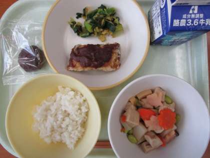 献立は、ご飯、牛乳、魚のネギみそかけ、ゆず昆布和え、吹き寄せ煮、おはぎ です。