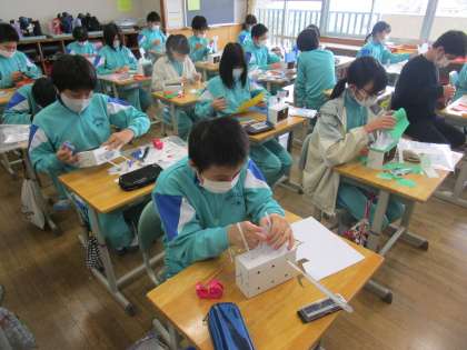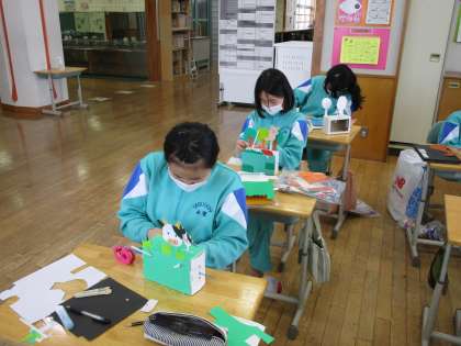 図工の学習では、「クランク」の仕組みを生かして、動くものをつくることを楽しみながら、作品制作を進めています。使えような材料をフル活用し、自分の思い描いた作品になるよう一生懸命取り組んでいます。