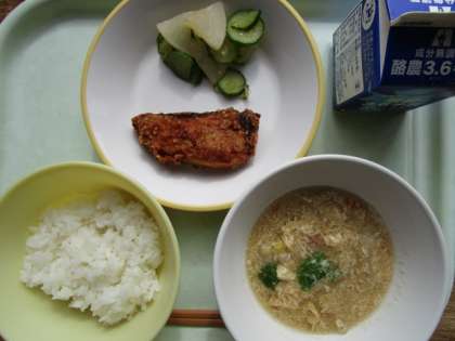 今日の献立は、ご飯、牛乳、魚の利休揚げ、レモン和え、中華かき玉汁 です。